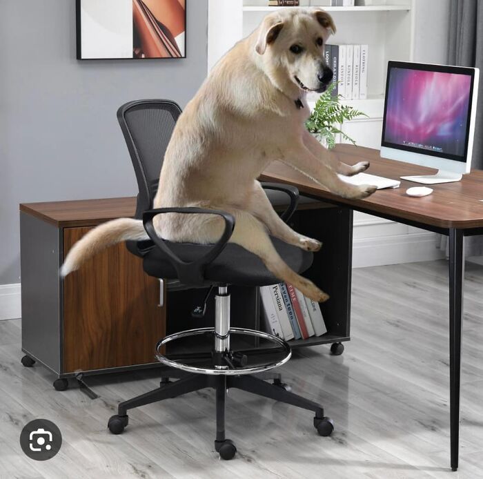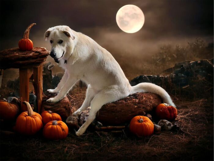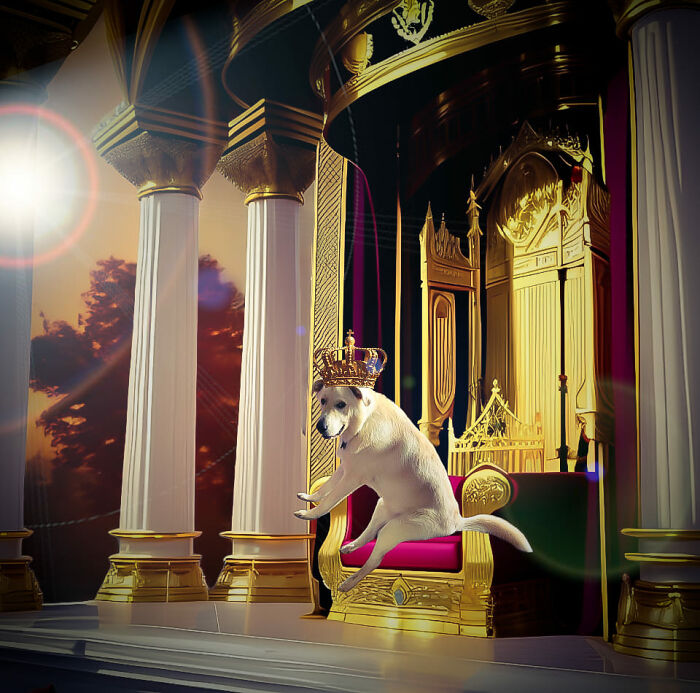 According to the post author, the pup in the spotlight of this online Photoshop competition is a Great Pyrenees mix called Aspen. As the poster wrote in the post description, sometimes, this guy likes to sit like people.
