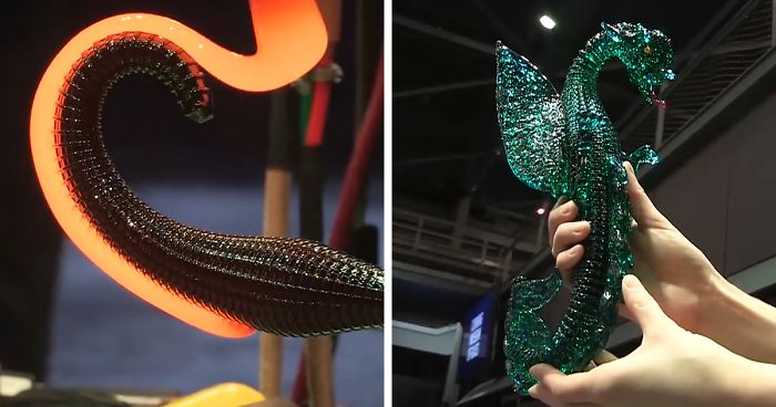 James Mongrain is an American artist who dedicated his life to glass. To create this dragon, James teamed up with the Corning Museum of Glass‘ team and together they explored traditional Venetian and Italian forms. “A lot of [my] animals come from traditional Venetian goblets,” James said. “They always have these little dolphins and swans, sea horses, and dragons, so I started making them larger and sticking them on the outsides of vessels. I think this one turned out pretty good.”