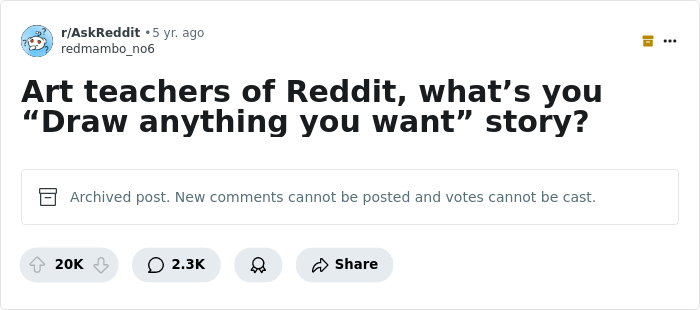 Yes, our selection today is dedicated to all sorts of creative embarrassments that happen when children's ingenuity spills out onto paper without any restrictions from teachers or parents. A few years ago, the user u/redmambo_no6 asked netizens on AskReddit: "Art teachers, what’s your 'Draw anything you want' story?" This resulted in a thread with 20K upvotes and over 2.3K comments.