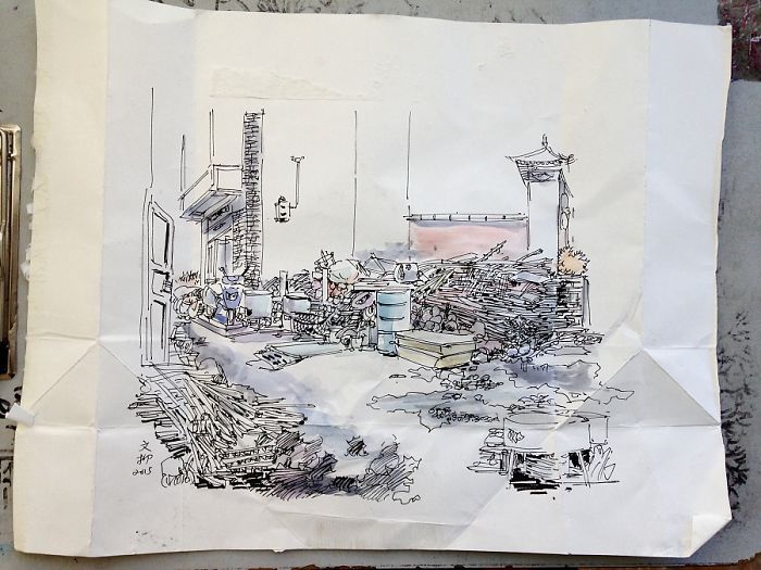 I am in Dali, Yunnan Province, China, is a very famous and beautiful old town with abundant culture heritage and natural resources. However we can always find littered paper packing box everyday in small alleys. So I was thinking that maybe those wasted paper packing box will be more useful than lying quietly in the dustbin. Then I start one project: early in the morning, with a pen, a painting board, no paper, cycling in the alleys of Dali Old town to collect wasted packing box. When I find one paper packing box, I will dismantle the wrappers, flatten it, and draw the architecture in front of me directly on it. After that, it will be nailed on the wall exactly where I picked it in order to be seen by more people. I want the art to be known not as something far away from our life, but something inside our life, even in the wasted paper clusters. What’s more, wasted paper turns out to be an art painting as well.