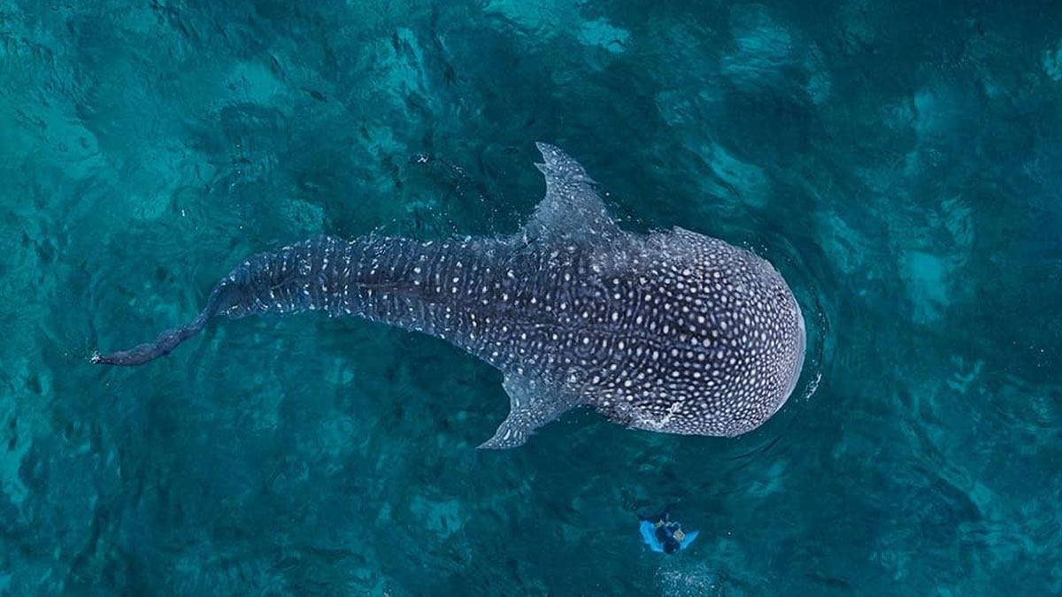 Drone photograph by Dimitar Karanikolov of a person in pink floating in clear blue water with ripples.