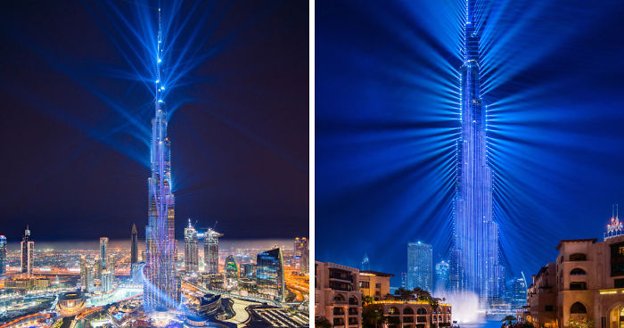 The laser show doesn’t only consist of lasers. Graphics are also beamed at one side of the Burj Khalifa along with some surrounding buildings. The show highlights the year of the Zayed (2018) with a portrait of UAE’s founding father Sheikh Zayed bin Sultan Al Nayhan.