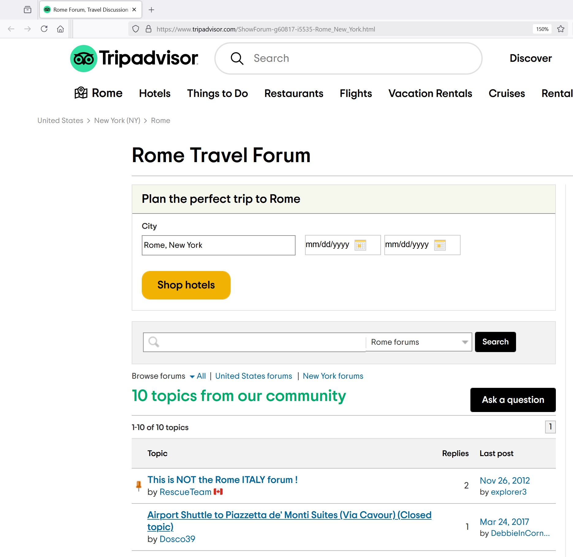 This seems like a good time to share a screenshot of TripAdvisor's forum for Rome, NY. Their forum for Rome Italy has nearly 107 thousand topics so it would be hard to find, but I'm sure there's at least one post asking if there's a McDonald's close the the (NY) Thruway. untitled-6...c4ed36.jpg