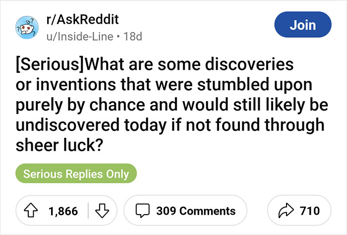 However, what’s not as evident is the fact that some of them were stumbled upon completely by accident. Members of the ‘Ask Reddit’ community have recently discussed such dumb luck discoveries and inventions, after one of them asked fellow netizens about things that would still likely be undiscovered today if it wasn’t for sheer luck. Redditors covered all sorts of instances, so if you’re burning with curiosity to learn more about them, wait no longer and scroll down to find the stories on the list below.