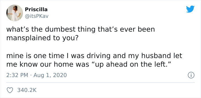 Fast forward to today, and women around the world still find themselves being mansplained to like it was no big deal. So when Twitter user Priscilla tweeted a question “What’s the dumbest thing that’s ever been mansplained to you?” it immediately went viral with 340.2K likes.