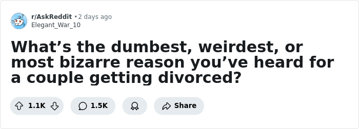 Someone asked netizens to share “the dumbest, weirdest, or most bizarre reason you’ve heard for a couple getting divorced” and people detailed their best stories. So get comfortable as you scroll through, upvote your favorite examples and be sure to add your own experiences and tales to the comments section down below.