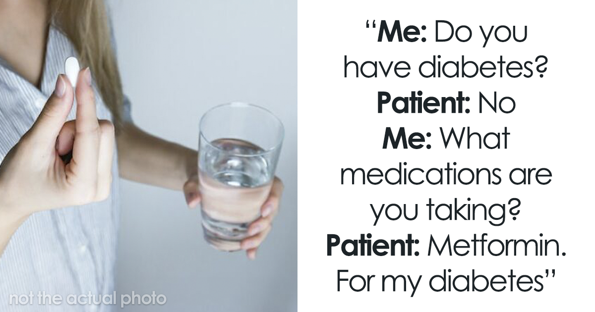 "Do you have any medical problems?" "No" "So no diabetes?" "No diabetes" "What medications are you taking?" "Metformin. For my diabetes." I facepalm every time