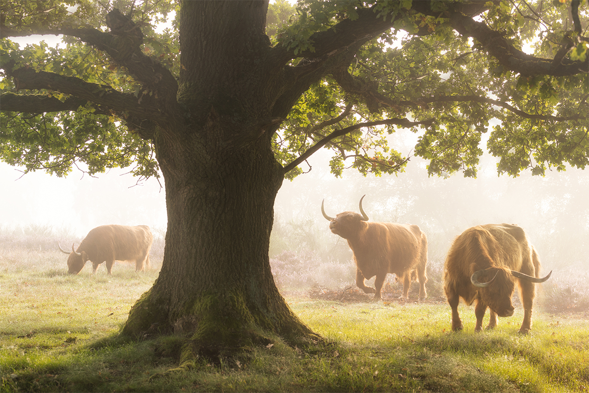 Green grass and trees. A foggy morning with a bunch of Scottish highlanders that you can ocassionally find on the heather fields. They look rather scary but they don't harm anyone if you don't disturb them.