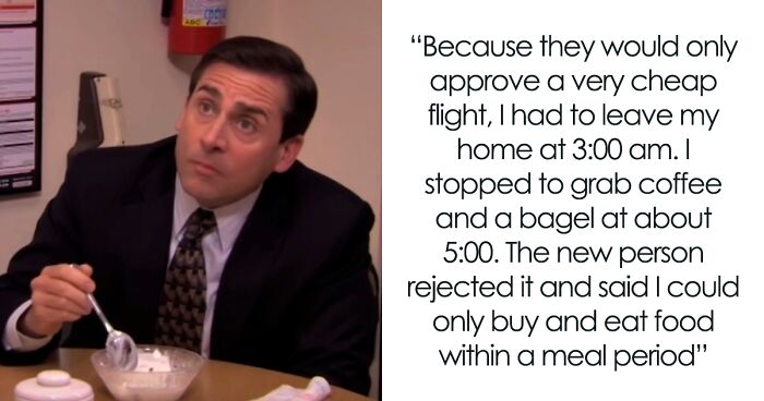 That day, the superiors only paid the travel expenses for the cheapest flight, so the OP had to leave their home at 3am. They stopped to grab coffee and a bagel around 5am. What surprised the OP was when the new person responsible for covering food expenses rejected the payment, stating that money should be spent only within the specified time frame.