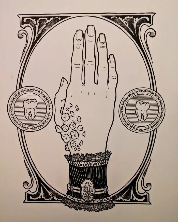 "This drawing is actually based on a dream I had years ago. In it, I was a girl in a private school with teeth growing out of both of my hands. My classmates would tease me by calling me "Chompers" and vertically smacking together these parts of their hands twice over and over. I always wanted to do something with the imagery, so here it is."