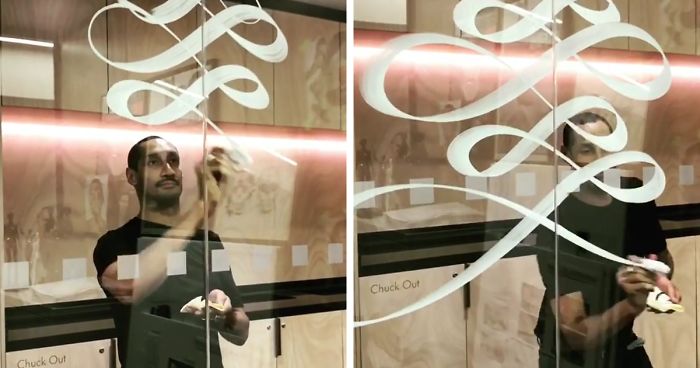 Paul Antonio is a calligrapher who makes complicated fonts look easy. This time Paul expressed his holiday spirit onto a glass office wall and it became a unique Christmas “tree”. Antonio trained as a scribe and heraldic artist and went on to specialize in ancient writing systems. His works on Egyptian hieroglyphs are even housed in the Metropolitan Museum in NYC.