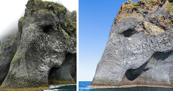 This basalt rock formation on the island of Heimaey in Southern Iceland looks just like a giant elephant or wooly mammoth dipping its trunk into the sea.