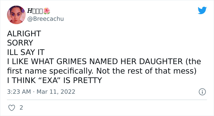 Nobody is arguing that Grimes’ and Elon’s daughter’s name is out of the ordinary and probably wouldn’t be allowed in other countries with a stricter baby naming system, but while most people were pointing out how weird it is and how the nickname Y just doesn’t make sense, there were people who actually liked the full name and found it cool.