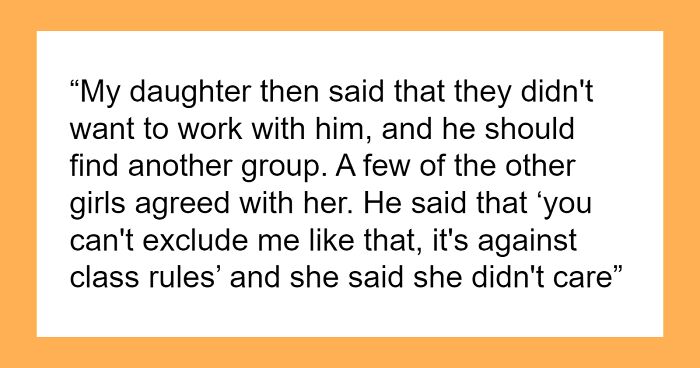 And so, after some time, the OP’s daughter returned home and said that during one of the lessons the students had to split into groups of 4-5 persons to work together. There were already 5 girls in her group when that boy approached them and literally demanded to be included in their group.