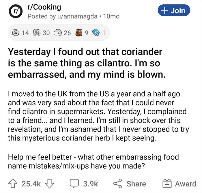 Redditor u/annamagda asked the people browsing r/Cooking to make them feel better after their coriander/cilantro fiasco and share their very own food mix-ups and cooking mistakes. It’s honestly a lot of fun reading what these redditors shared, and we’ve collected the very best responses for you, dear Pandas. Don’t forget to upvote your fave answers and if you’d like to spill the tea about your own supermarket and kitchen sins and blunders, Gordon Ramsay will take your confession in the comment section.