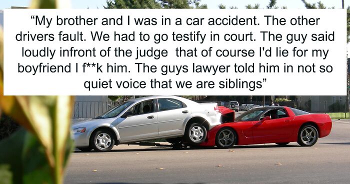 My brother and I was in a car accident. The other drivers fault. It's kinda easy to see that my brother and I are siblings we keep out of eachothers space. Like we sit on opposite sides of a row of seats. They sued the insurance company and we had to go testify in court. The guy said loudly infront of the judge and lawyers that ofcourse I'd lie for my boyfriend I f**k him. The guys lawyer told him in not so quiet voice that we are siblings. He turned beet red and lost the case since the evidence clearly showed he was at fault. I had to wait till we left the court to laugh my a*s off.