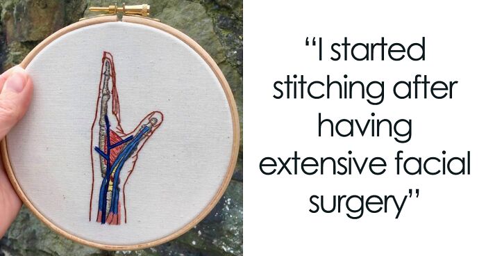 Nothing is as fascinating, exciting, and challenging as human anatomy and single-stranded stitches are perfect for accurately rendering its colors and textures. In fact, in each of my specialist pieces, I only ever use satin stitch, split stitch, French knots, and couching, all basic stitches in embroidery!