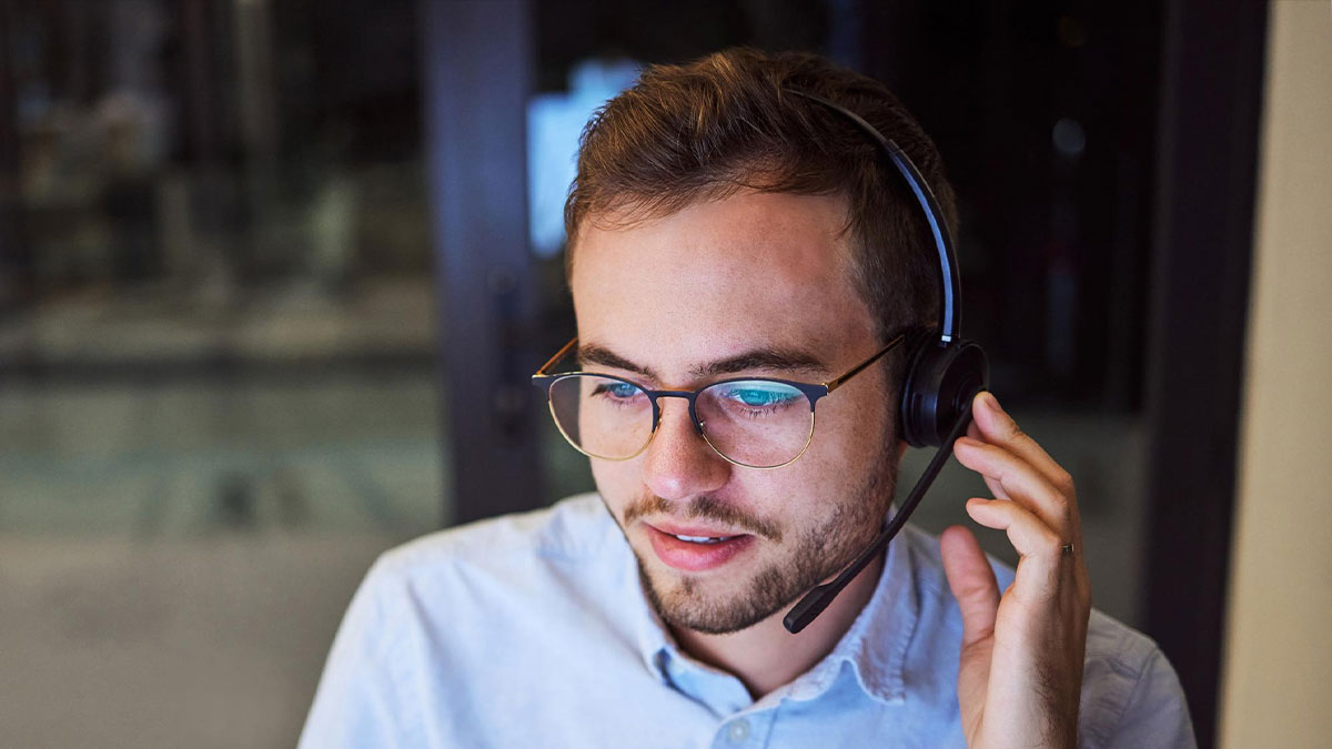 Employee wearing glasses and headset speaking to a customer, revealing personal secrets and causing chaos.