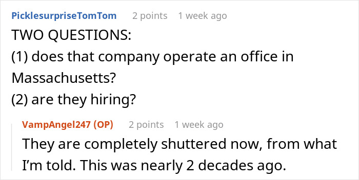 To learn more about what inspired Reddit user VampAngel247 to share this story in the first place, we reached out to her, and lucky for us, she was happy to have a chat with Bored Panda. “I’m fairly new to Reddit, and I loved the sub, and this was the first thing I thought of after reading a few posts,” she shared. We were also curious what she thought of this particular job. “[It] was okay, definitely not my favorite one that I’ve ever had, but definitely also not the worst,” VampAngel247 revealed, noting that she “infinitely preferred the temporary boss to the permanent one.”