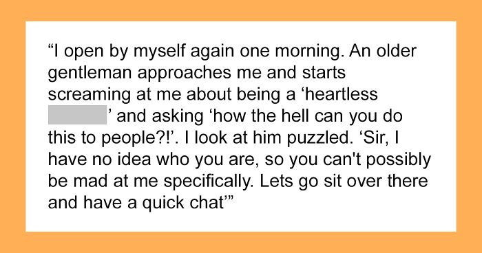 However, months later when the OP was opening once again, a man walked up to him screaming and calling him names. The ex-employee was confused, to say the least, however he offered the man a chance to sit down and discuss the issue in a calm manner.