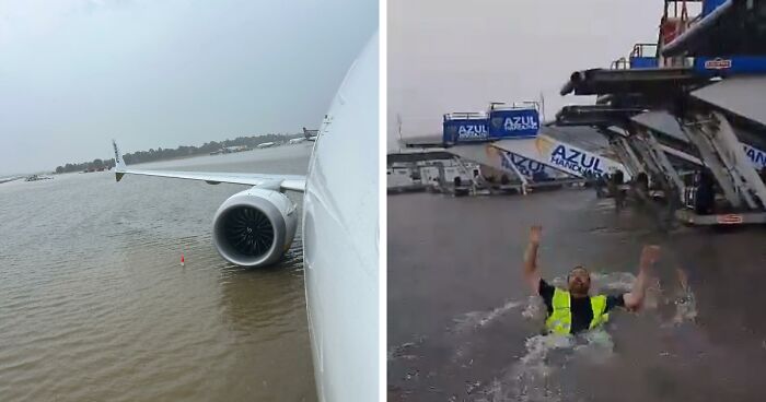After Airport Floods, Hilarity Ensues As Workers Clean Up Water With Brooms, Swim On The Tarmac
