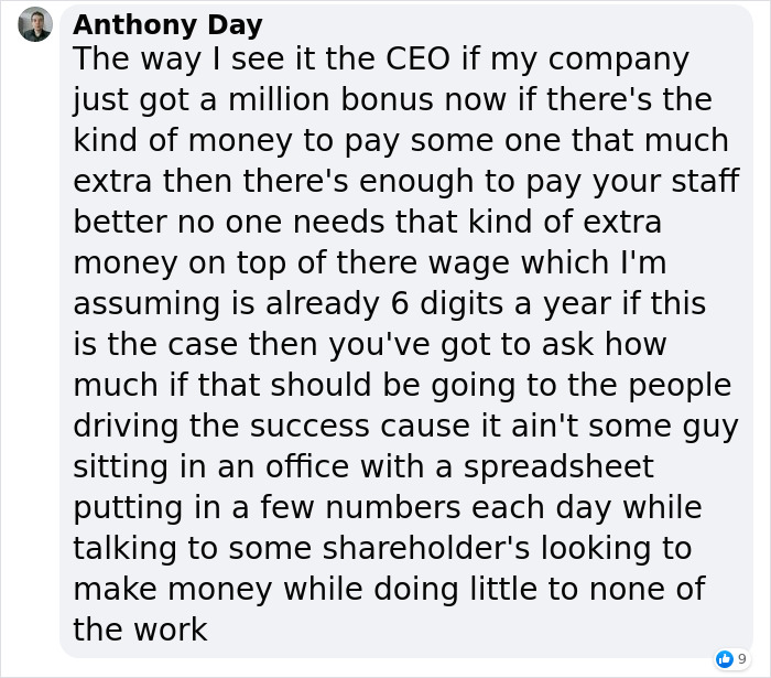 Load More Replies...No CEO should earn more than 10x their lowest paid employee. It is the employees who keep the company open and rolling, and they should all be compensated fairly. No, don't raise the prices to pay them more- cut the top salaries and use that money to pay them more.