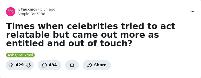For the regular folks, it’s hard to relate to someone who flies to Paris only for the afternoon on their private plane or eats chef-made sushi for breakfast. And yet celebrities still want to appeal to their fans by trying to be relatable while doing all of these things. Sometimes, they succeed, but other times, they miss the mark so badly that the whole world collectively cringes.