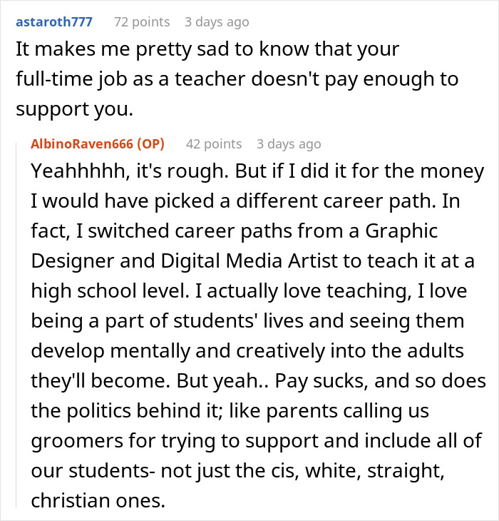 Load More Replies...The thing that actually pissed me off about this story is that a full-time teacher's salary is not enough to pay the bills.
