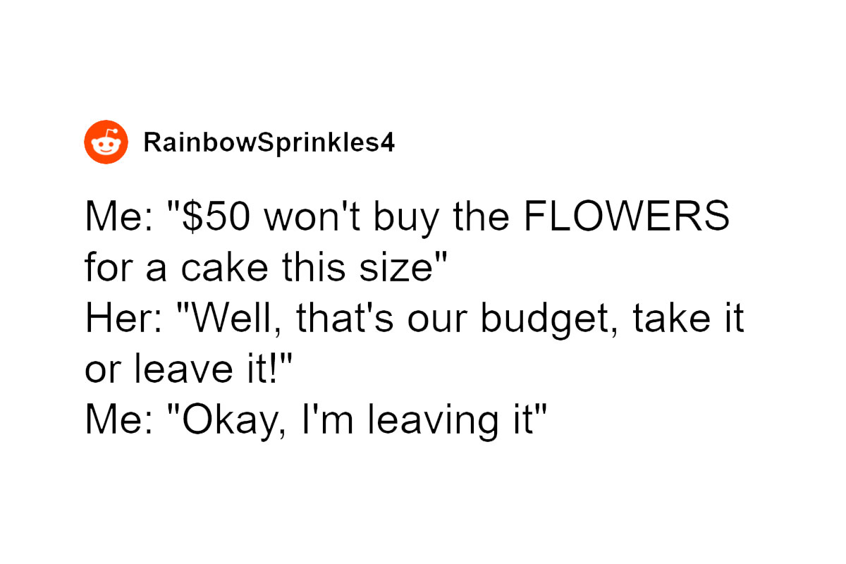 Load More Replies...Ummm, hello Bridezilla, go to Wal-Mart buy 3 box cake mixes and make the damn thing yourself. Then hop on over to The Dollar Tree and get the rest of the c**p, you know, fake flowers, plastic cake stand, etc. There ya go, all for $50!!!