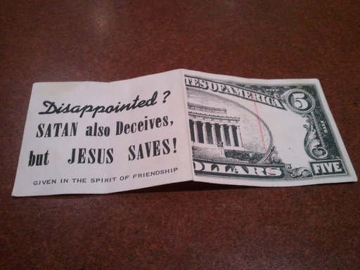 I was a waitress in college and HATED the after church crowd on Sundays. They would "tip" with religious traits and pamphlets. I caught it one day before the person left the restaurant. I ran up to them, handed it back, and said, "Sorry, but this doesn't pay my electric bill. But I'll pray for you that you stop being someone who stiffs a hard-working waitress her earned tip." And walked away.