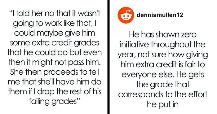 The poster told commenters that, “I don’t plan on backing down on my position. The one study guide he has that he can turn in for extra credit is given to all of my students. They all have the same opportunity to drop and replace their lowest grade with it which is why I told the mother that it was the best I could do.” Despite providing a reasonable solution to help the boy pass, his mom did not budge on the issue and wanted the problem solved with no effort on her son’s part.