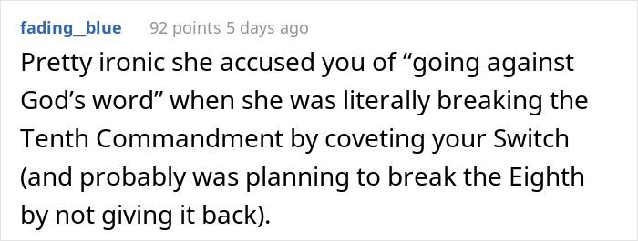 The author also added that she didn’t have a problem with the “entitled” woman initially asking her if her son could borrow her Switch. “I understand that completely… but when I said no, that should’ve been the end of the conversation. Her child could’ve learned a lesson somewhere in that interaction, but instead, it became an uncomfortable moment in my flight that I’ll likely never forget,” she concluded.