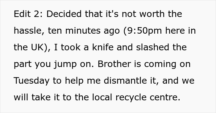 Load More Replies...Yo this Karen is out of her mind, the writer was beyond kind to let her children jump on the trampoline for 3 hours. Now Karen be thinking she and her children own the place. Just buy a trampolines for your children and quit being a Karen.