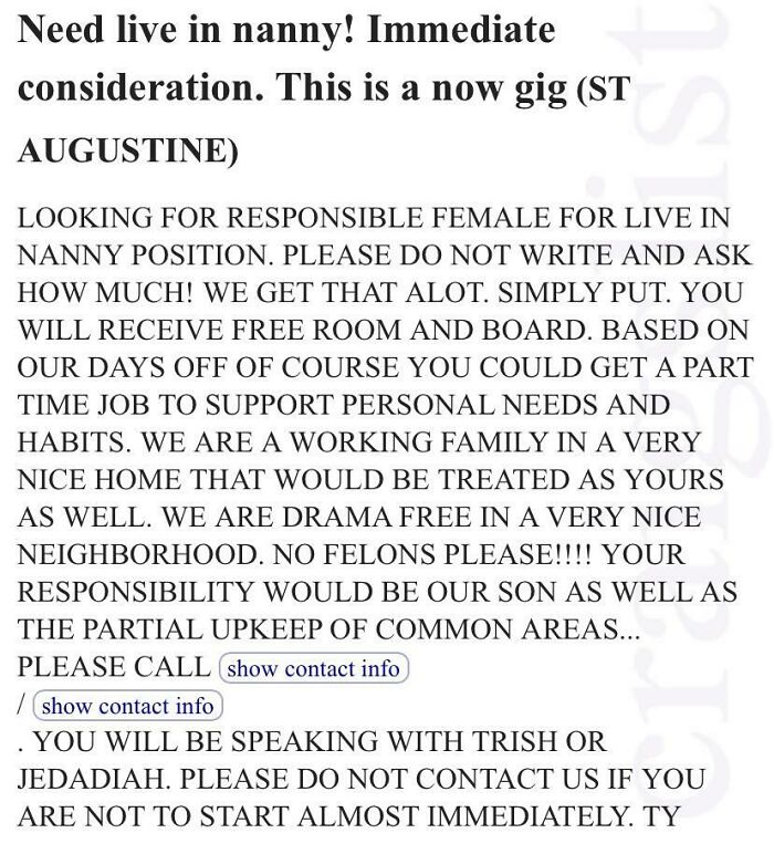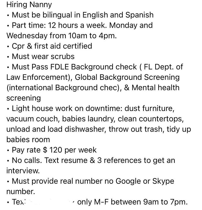 And while we all know that finding a good nanny is a mission in its own right, some parents seem to take a more delusional approach to it. From requirements through the roof to offering “free hands-on parenting experience” and charging a live-in nanny, these are among the countless nanny job ads we just couldn’t make up.