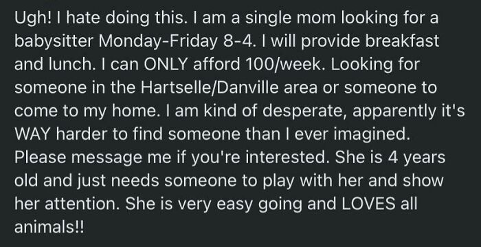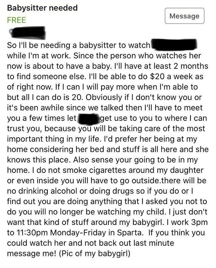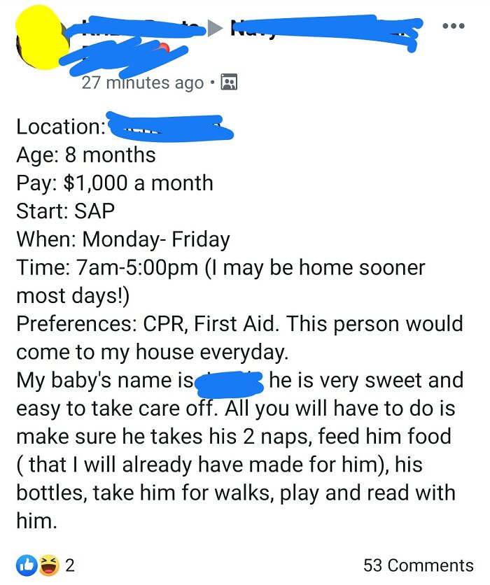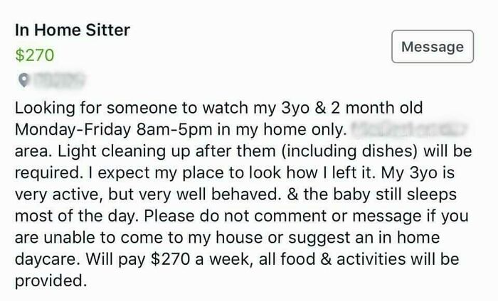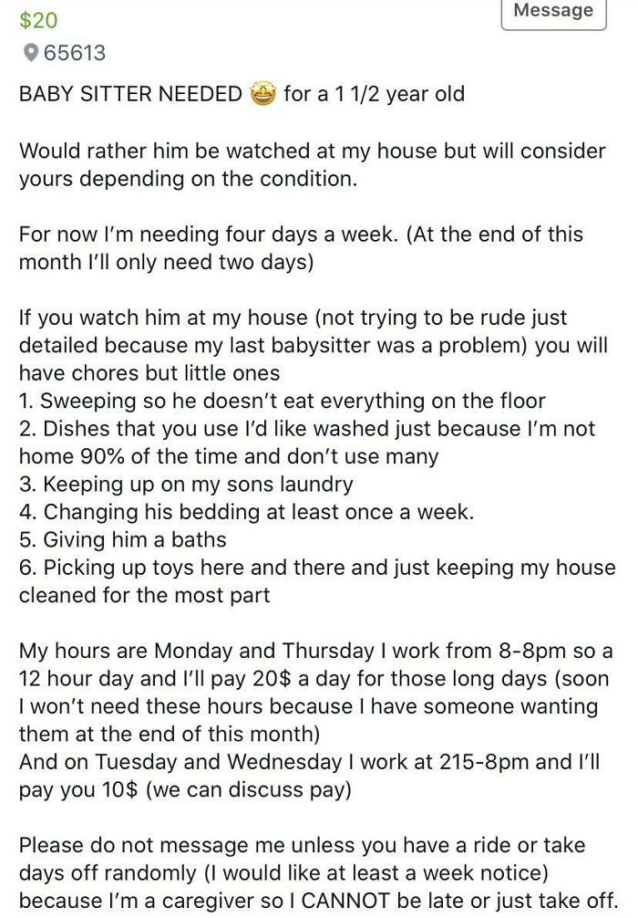 From My Town’s Facebook Page. She Wants A Babysitter For Two Infants To Come To Her Home And Clean For Less Than Minimum Wage?