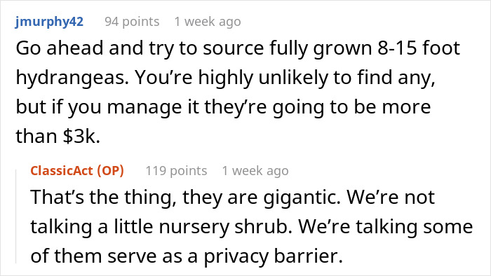 The OP told Bored Panda that the most annoying part of it all was that the previous owners really harped on the fact that the current owners don’t know how much these plants mean to them. “Which was true,” the redditor pointed out. “Had they told us upfront—before closing on the property—that they had some kind of attachment to the bushes, we could have worked something out. It’s the fact that they said nothing, we paid for the property as is, and have planned other landscaping around the hydrangeas, and now years later come out of the woodwork about it that rubbed me the wrong way.