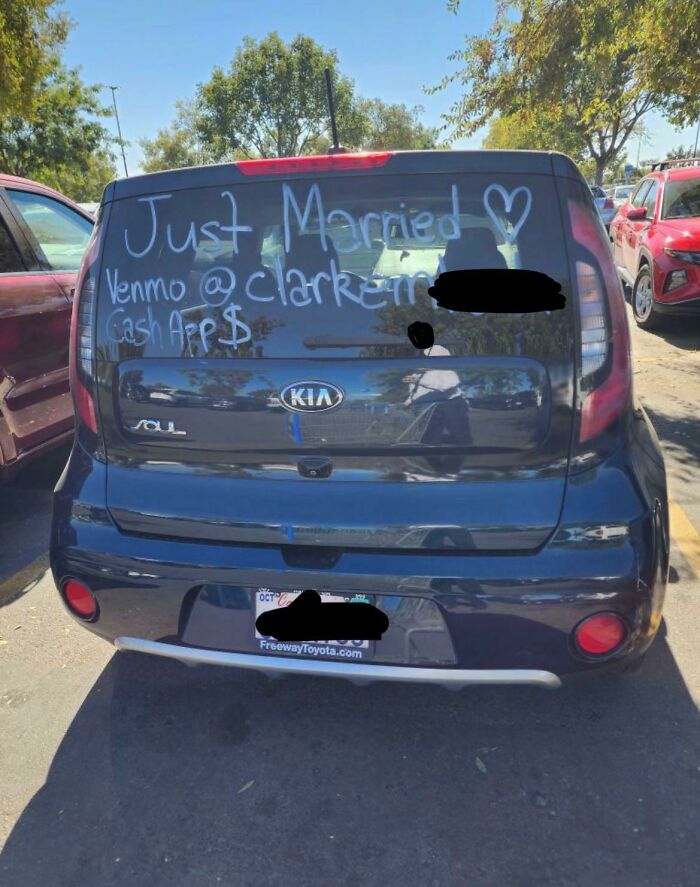 My Dad Sent Me This Pic Of A Car He Saw Today. Newlyweds Are Now Asking For Money From Strangers Via Venmo And CashApp. This Has To Be Trashy, Right?