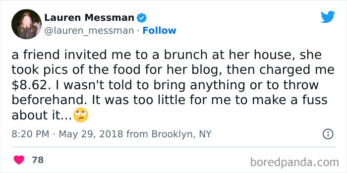 Step 1: “I dipped into the salsa 21 times, not 19, so here’s $0.42.” Step 2: Stop being friends with this person.