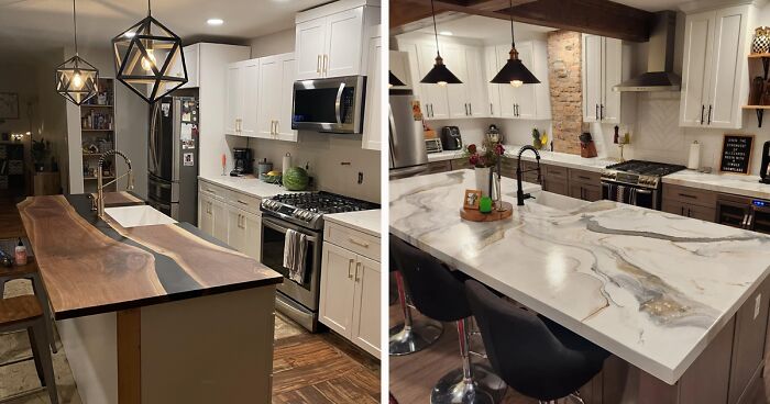 Side-by-side kitchen images featuring epoxy countertops with wood and marble finishes, showcasing modern design and lighting.