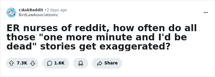 Otherwise, I have definitely heard my fair share of pt stories about being on the brink of death when they weren't, having experiences within healthcare that would never happen or are impossible, or presenting labs/exam findings/med doses that are meant to show the severity of something that do the opposite. Most of the stories I've read on Reddit about people reporting they woke up during surgery seem incredibly exaggerated if not completely made up based on the way that ORs are set up and how surgeries are done. Just about any story you see including things like "so the nurse saw my leg and just started screaming," or "all the doctors and nurses were shocked and had no idea what to do" are likely exaggerations as well. There is very little that actually shocks medical staff, and nurses have seen s**t and can handle a lot. I've had numerous patients sit down in front of me and say that they are likely the worst/most f****d up person I'll ever meet, that they've gone through the worst trauma I've probably ever heard of, or made comments like "yeah, you're probably wondering how I'm even still alive right now." In all cases, they have been wrong. The worst/most f****d up patients I've ever met don't consider themselves so. The worst trauma I've ever heard of has come from patients who don't put a lot of thought into comparisons. There are definitely pts that amaze me by still being alive, but none of them boast about how bad they have it like there's an award for the most suffering a human being can experience.