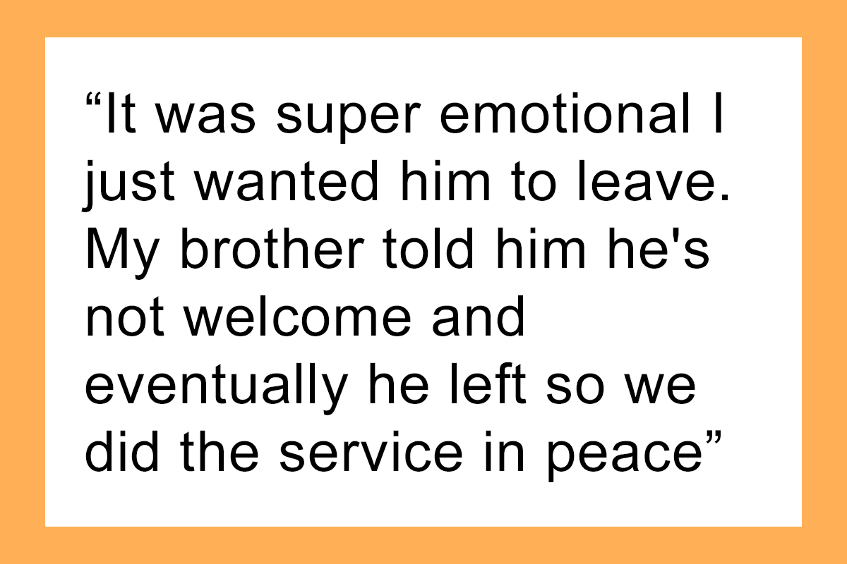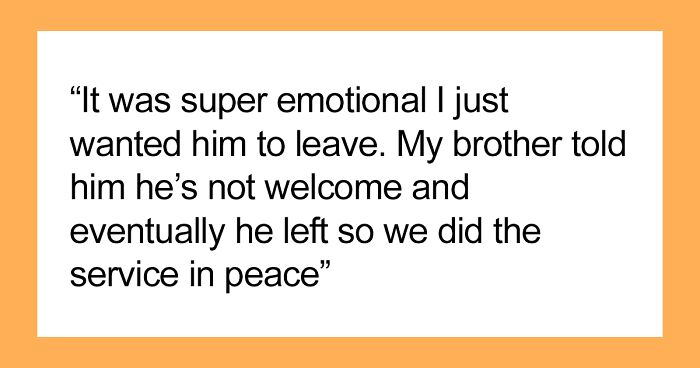 But, unfortunately, the woman had recently passed away. The OP’s brother and their grandmother were in charge of the funeral and agreed to keep it small, yet they found themselves in quite a position when their estranged father showed up on the morning of the ceremony. However, without thinking twice, he was immediately told to leave because, for obvious reasons, neither the siblings nor the majority of the family actually wanted him there.