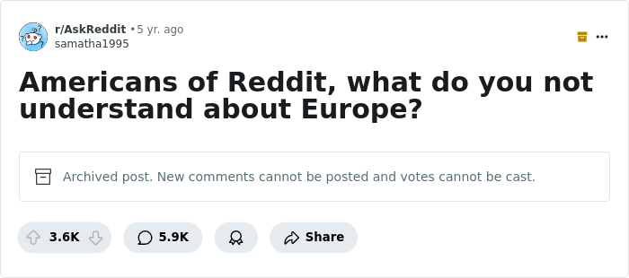 Load More Replies...I'm sorry, but these America-Europe cultural differences posts are becoming very repetitive and boring. At the very least, let's see some posts about other continents like Africa, South America or Australia - at least somewhere that's NOT the US or Europe.