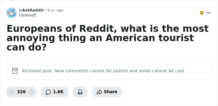Load More Replies...Yeah yeah, #not all Americans. And people from other countries can suck too. That's a given. This is the stereotype and therefore not universal but the bad ones stick out like a sore thumb and give others a bad name. Travellers going anywhere should be thoughtful, respectful, kind and open to new things. And thankfully many (hopefully most) are.