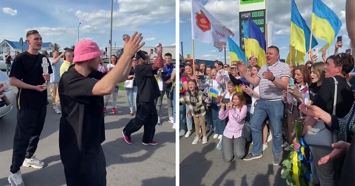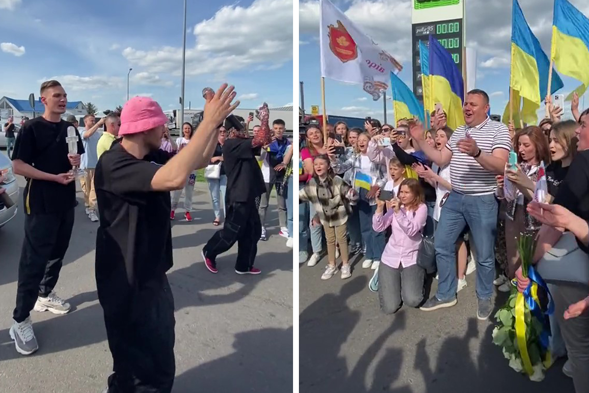The group returned home on Monday and were greeted at the Polish border by servicemen and women, as well as a group of fans, showing their support. Oleh was presented with a bouquet of yellow and blue flowers, in honor of Ukraine’s flag, and reunited with his girlfriend before they sang an impromptu version of Stefania.