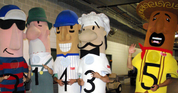 Today, there are some similar competitions held at other big league ballparks, but the Brewers’ Racing Sausages were the first live-action figures to race in the majors as a regularly scheduled event. What began as a cartoon video board race in the ’90s at the old County Stadium evolved into a live race, with the five Racing Sausage contestants exuberantly embraced by the home crowd. These races have taken place after the top of the sixth inning at every home game since the opening of Miller Park in 2001, and now continuing in the renamed stadium, American Family Field. The roar of the crowd is often louder for the Sausage Race than at any other time during the game. People bet on which character will win and they even have the Sausage standings every day in the local newspaper.