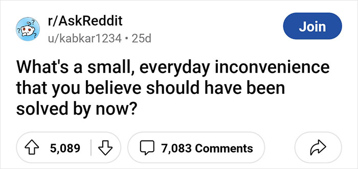 The author of this thread told Bored Panda that a common daily inconvenience prompted them to ask other Redditors what they find annoying. "My wife and I started talking about finding [the] remote all the time," u/kabkar1234 says. "[We] got talking about how small things like these are still [un]resolved with all the advancement in the world. I thought of asking the public."