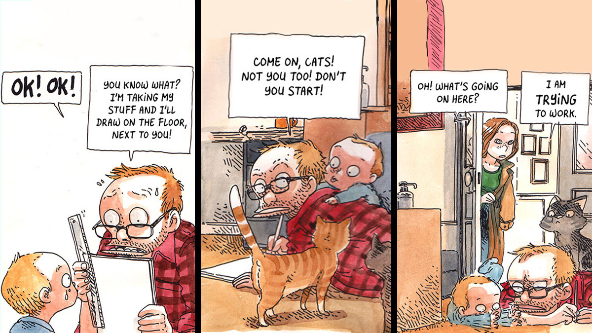 A lot of these panels read like tiny “caught on camera” moments. One second, everything is calm, and you’re convinced you’ve finally found the perfect setup: the kid is playing, you’re working, and you’re being responsible about it. Then the baby makes one noise that could mean anything, and you’re instantly in full emergency mode, sprinting back with the emotional intensity of someone defusing a bomb. Boulet nails that modern-parent whiplash, where “keeping an eye” somehow becomes a full-time job for the part of your brain that refuses to relax.