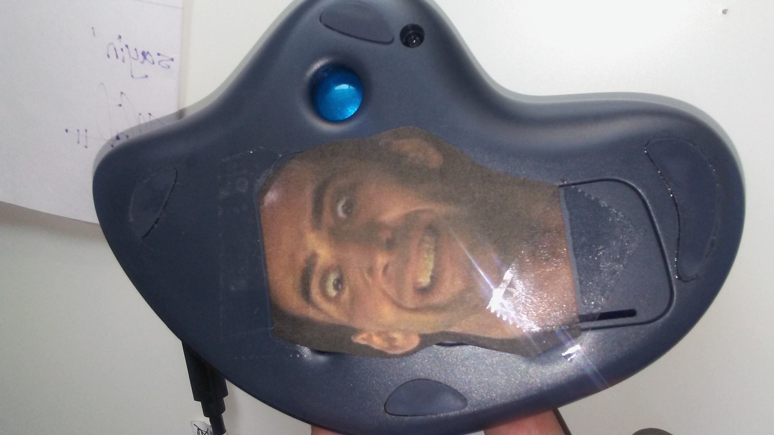 I turned my husband's mouse off so he'd flip it over, to where I had taped a picture of Nicholas Cage. PS - I'm 61 & he's 66. 20170805_1...f9b8dd.jpg