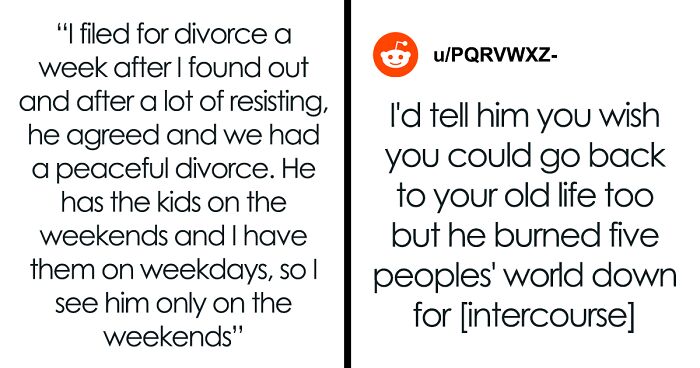 Load More Replies...Ex-Husband is the real s l u t here, since he was then sleeping around, so that name-calling he did is merely him projecting his guilt and shame onto OP. He f****d around (literally), and now he's finding out---and he can't handle it. Womp. Womp. Sucks to be him, I guess. OP's having fun for the first time since she was in her mid-teens. OP, enjoy your life. Maybe you'll meet someone who truly appreciates you and would never even think of looking at another woman because he's already with you. Maybe you won't (dating as an adult woman can be a f*****g minefield of weird and broken men sometimes), or maybe you don't even want to, and that's cool. From now on, YOU get to make all the decisions for how your life, and your kids' lives, will be lived. Enjoy that autonomy. Revel in it. And don't let Mr Pissypants who purposely blew up the old life start peeing all over your fun, just because the grass wasn't greener on the other side, and his side piece probably dumped him for being the insufferable a*****e he is, and always has been.