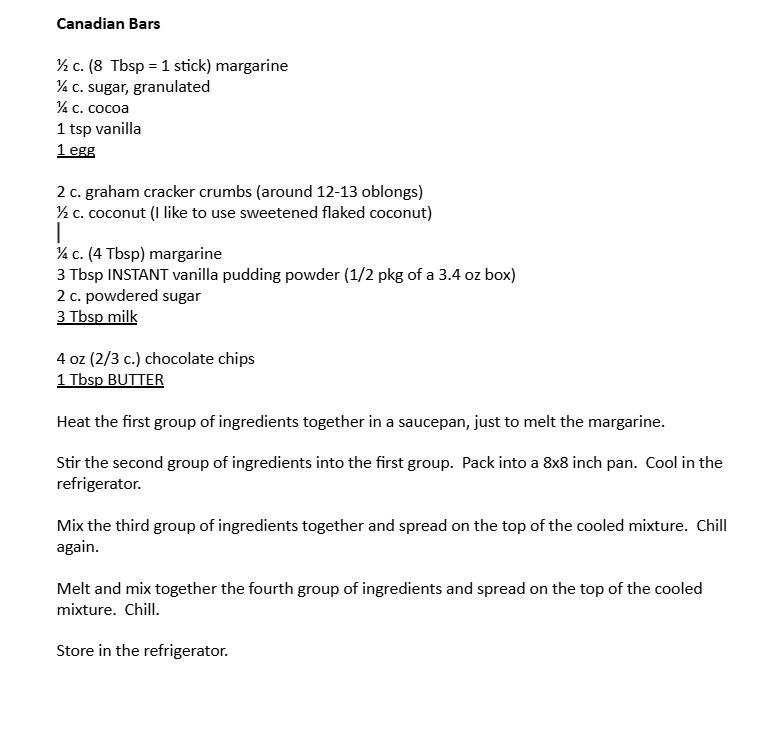 Nanaimo Bar Recipe Bottom Layer 1/2 cup unsalted butter (European style cultured) (125 ml) 1/4 cup sugar (50 ml) 5 tbsp. cocoa (75 ml) 1 egg beaten 1 3/4 cups graham wafer crumbs (425 ml) 1/2 cup finely chopped almonds (125 ml) 1 cup coconut (250 ml) Melt first 3 ingredients in top of double boiler. Add egg and stir to cook and thicken. Remove from heat. Stir in crumbs, coconut, and nuts. Press firmly into an ungreased 8" x 8" pan. Second Layer 1/2 cup unsalted butter (125 ml) 2 Tbsp. and 2 Tsp. cream (40 ml) 2 Tbsp. vanilla custard powder (30 ml) 2 cups icing sugar (500 ml) Cream butter, cream, custard powder, and icing sugar together well. Beat until light. Spread over bottom layer. Third Layer 4 squares semi-sweet chocolate (4 oz) 2 Tbsp. unsalted butter (30 ml) Melt chocolate and butter over low heat. Cool. Once cool, but still liquid, pour over second layer and chill in refrigerator.